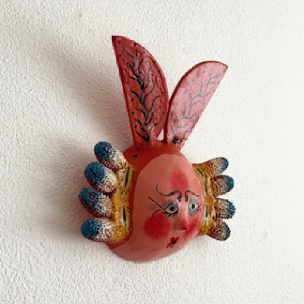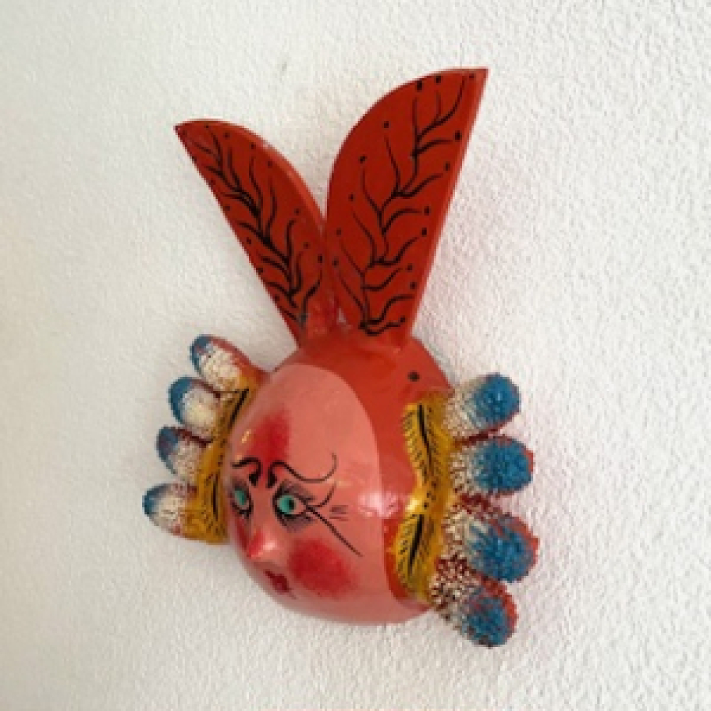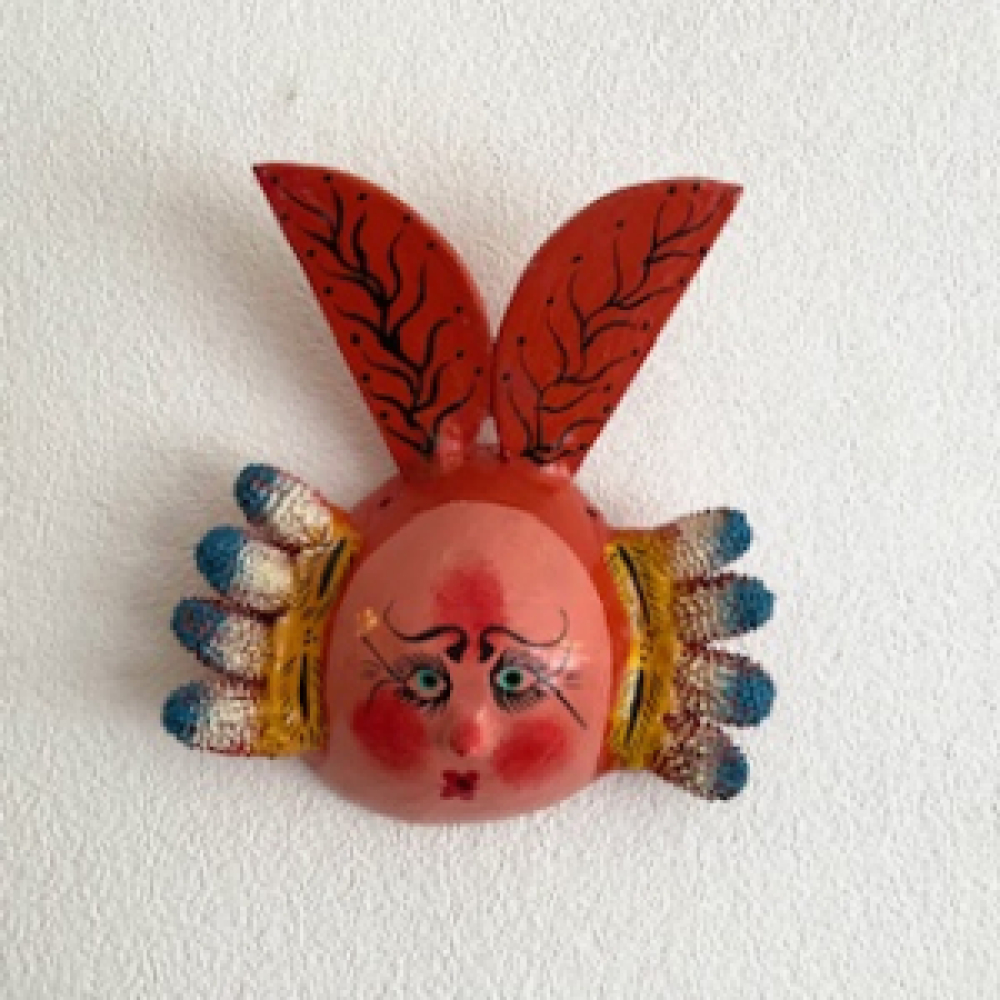 Een Mexicaans masker met konijnen oren, gemaakt van kokosnoot. Leuk om aan de wand te hangen. Traditioneel wanddecoratie uit Mexico. Het is met de hand gemaakt en met de hand beschilderd. Het kokos masker is in een goede vintage gebruikte conditie, zie foto's. De foto's behoren tot de omschrijving.
