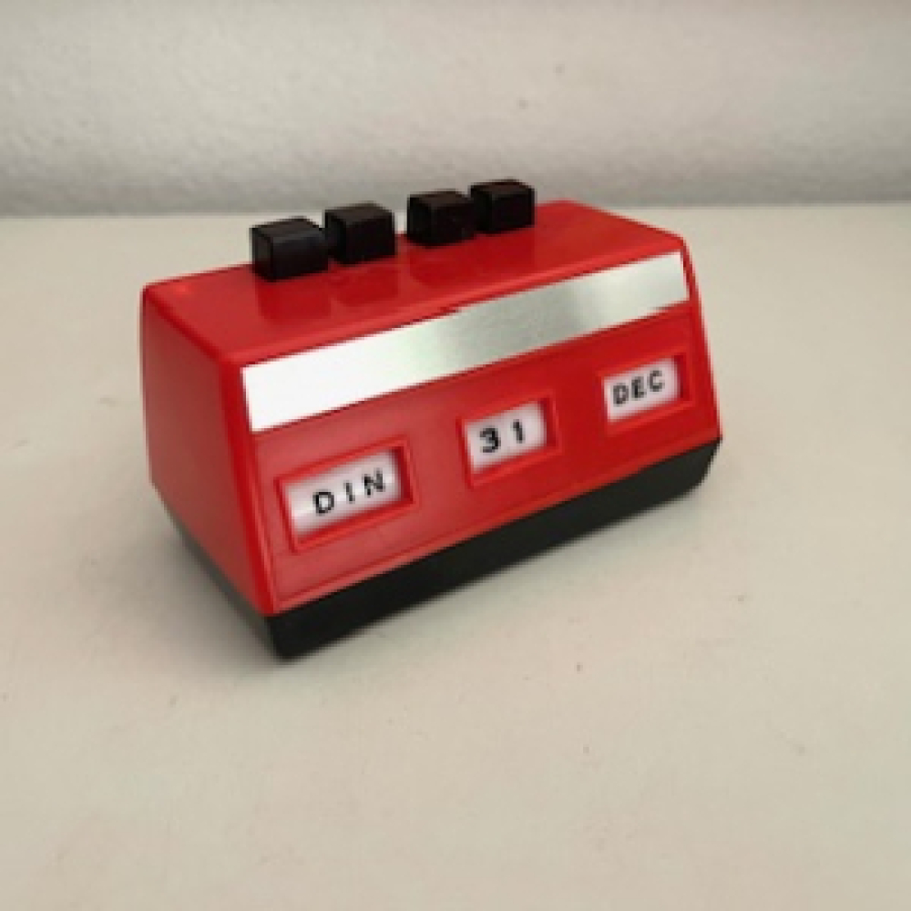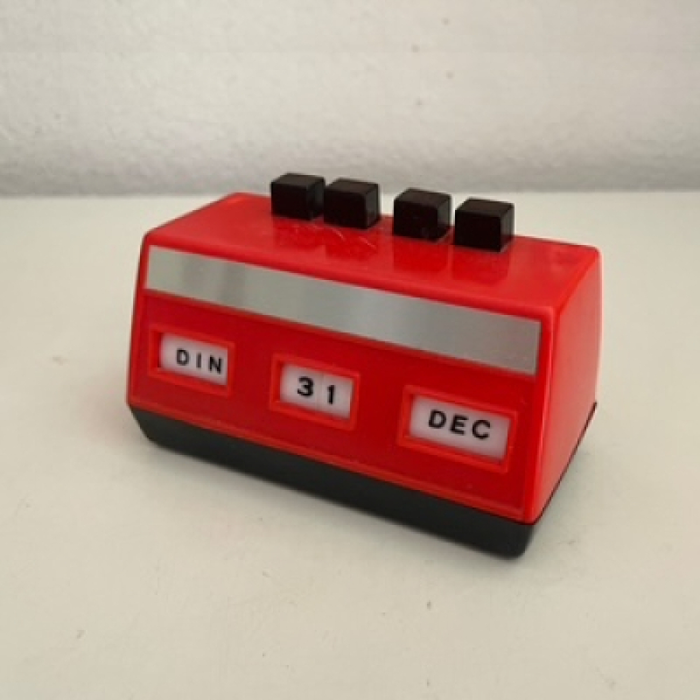 Leuke dagen kalender origineel uit de jaren '70. Door de zwarte knoppen aan de bovenkant in te drukken kan de dag - datum - maand in gedrukt worden, hierdoor noemen we dit een oneindigende dagkalender. Het bestaat uit rood kunststof en kan op de tafel / bureau gezet worden. De kalender verkeerd in een vintage gebruikte conditie en heeft een een klein lichter plekje in het plastik op een hoek, zie foto's. De foto's maken deel uit van de omschrijving.
