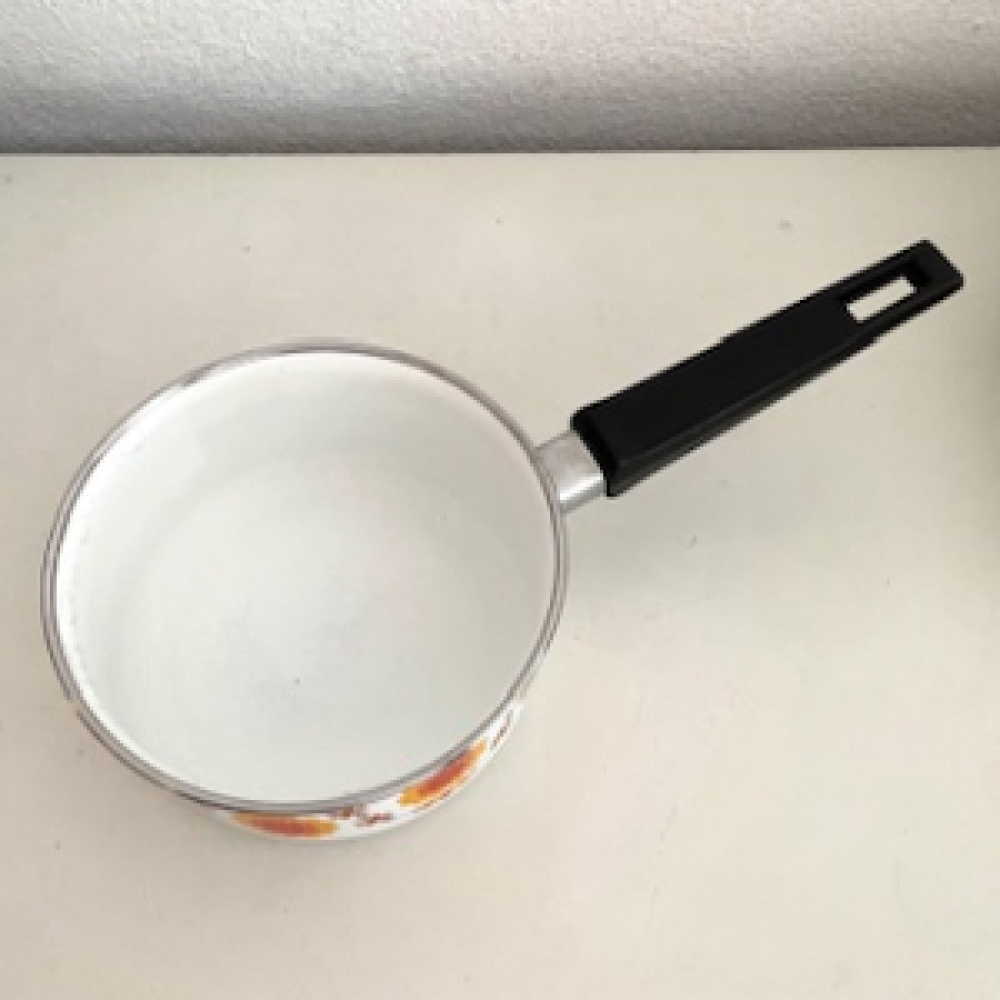 Set mooie wit met oranje bloemen steelpannen beschikbaar in 3 verschillende maten: Ø13cm, Ø15cm en Ø19,5cm. De steelpannen zijn in een goede vintage gebruikte staat. Alleen de grootste steelpan heeft minimale gebruiksporen, zie foto's. De foto's maken deel van de omschrijving.