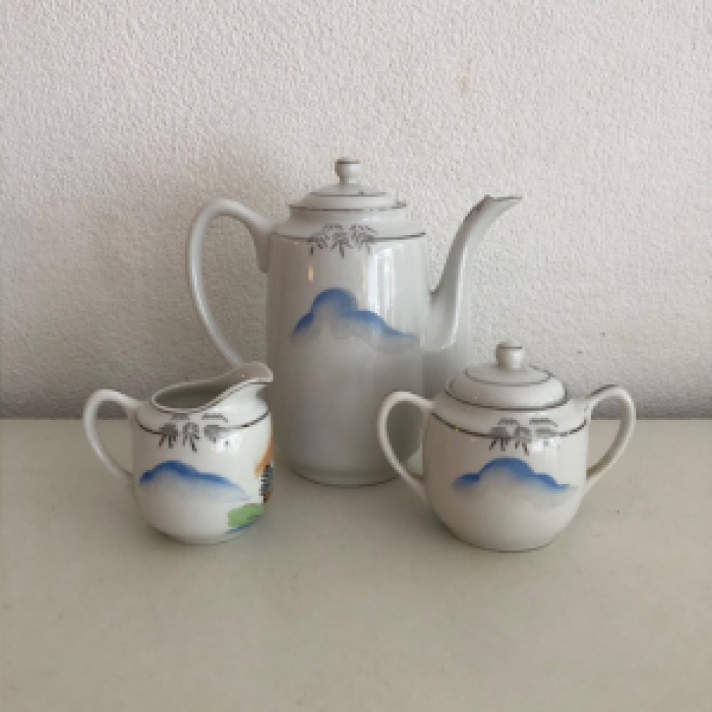Prachtig beschilderde 17 delige set. Met de hand geschilderd thee / koffie servies van Ritz China. De kopjes hebben reliëf op de bodem van het kopje in de vorm van een Geisha gezicht. Deze mooie set is in een zeer goede en onbeschadigde vintage staat, zie foto's. De foto's maken deel uit van de omschrijving.