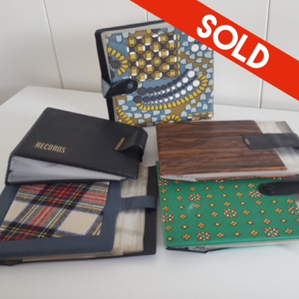 Jaren '60 vinyl mapjes met 20 plastic vakjes/hoesjes, waarin ongeveer 30/40 singles veilig in opgeborgen kunnen worden. Ze zijn per stuk voor €16,50, maar per 5 stuks geven wij een bundel korting. Klik rechts boven aan de pagina alleen het bolletje aan in welke optie je geïnteresseerd bent. Als er interesse is naar de 5 stuks samen, dan vink je het bolletje met 5 stuks samen aan.