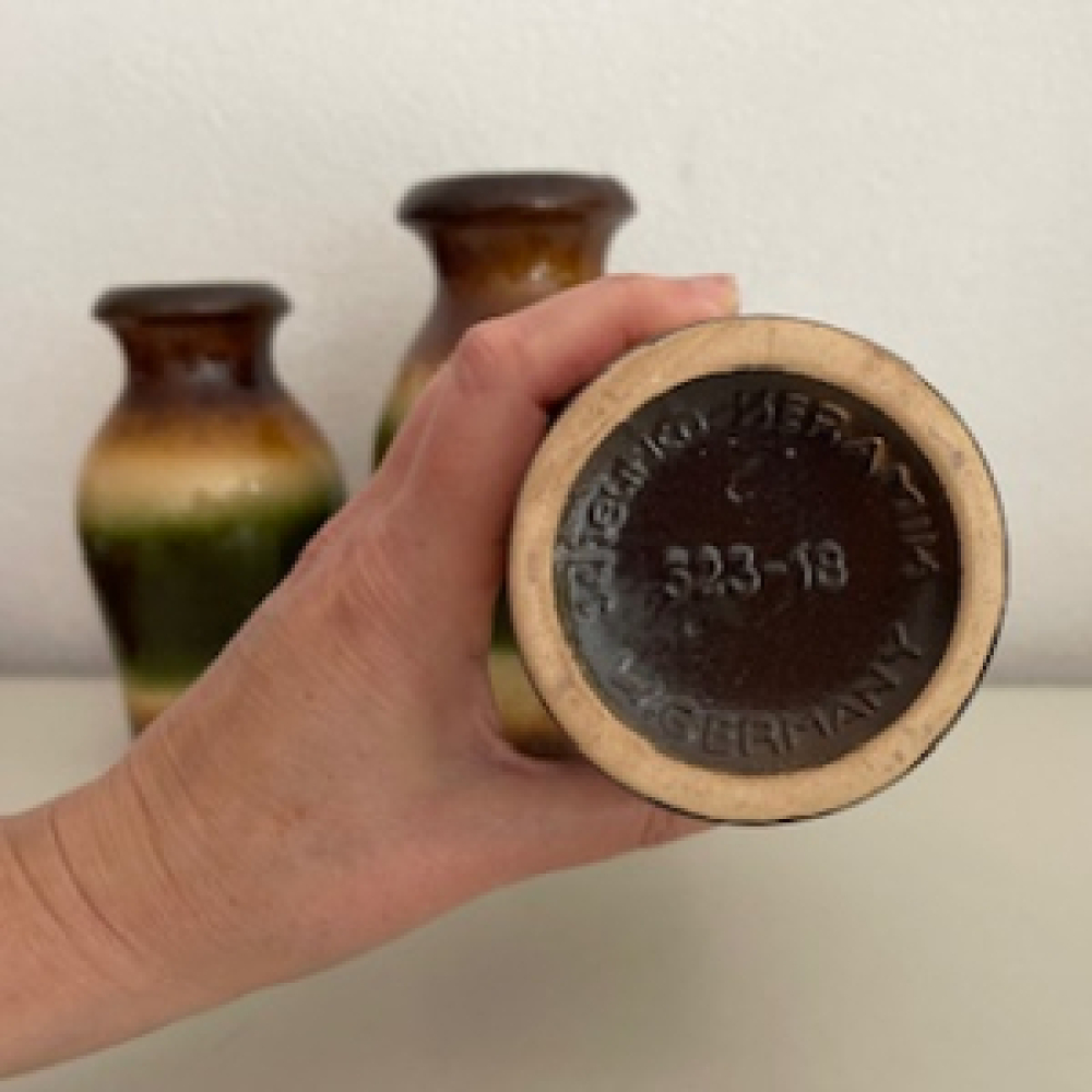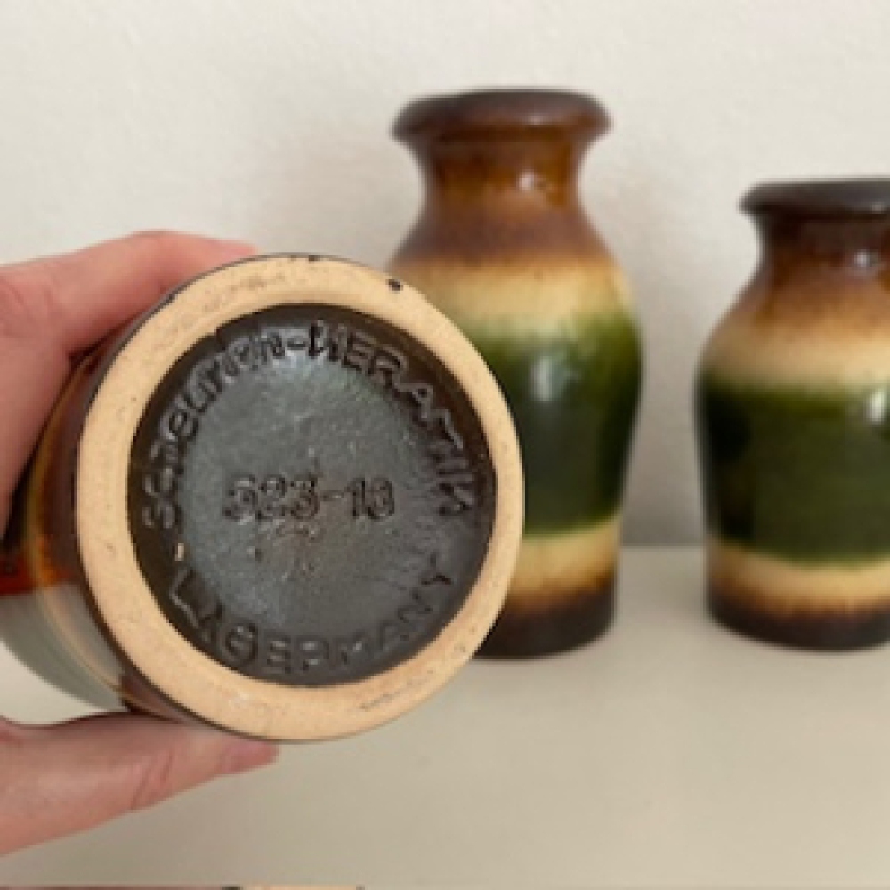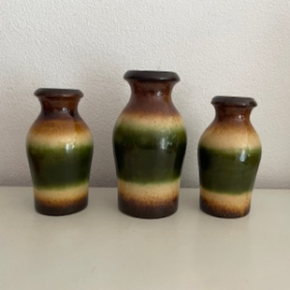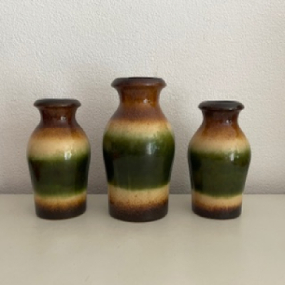 Set van 3 mooie vintage Scheurich vazen; 2x 18cm hoog en 1x 21cm hoog. Origineel uit de 60-er 70-er jaren met de herkenbare 'wiebel' decor uit die tijds periode. De keramieken vazen zijn in groen met creme wit / beige op bruin.