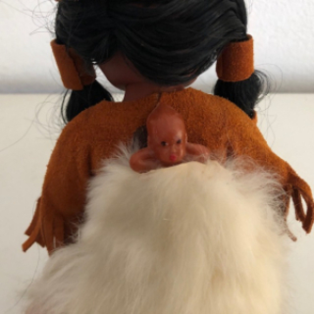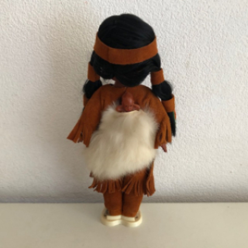 Mooie vintage pop met baby op de rug