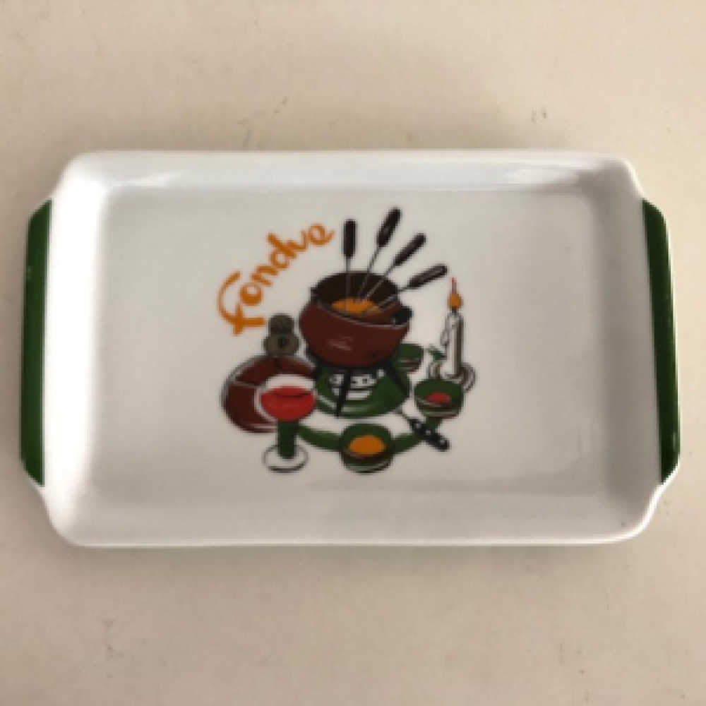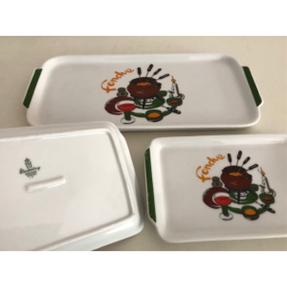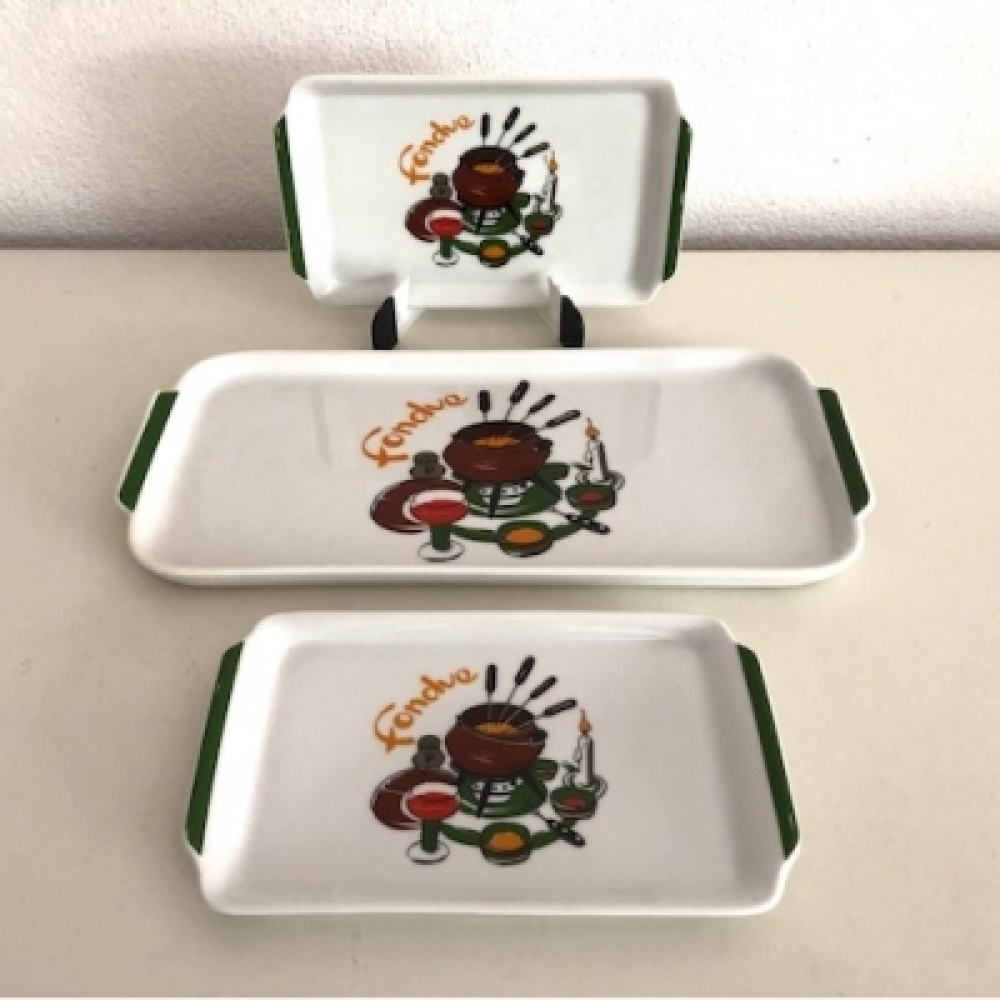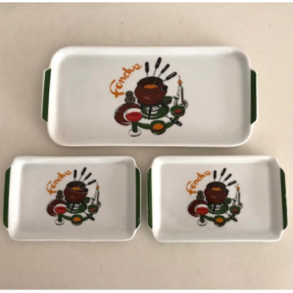 Mooie vintage serveerschalen; 3 schalen / borden met fondue decor
