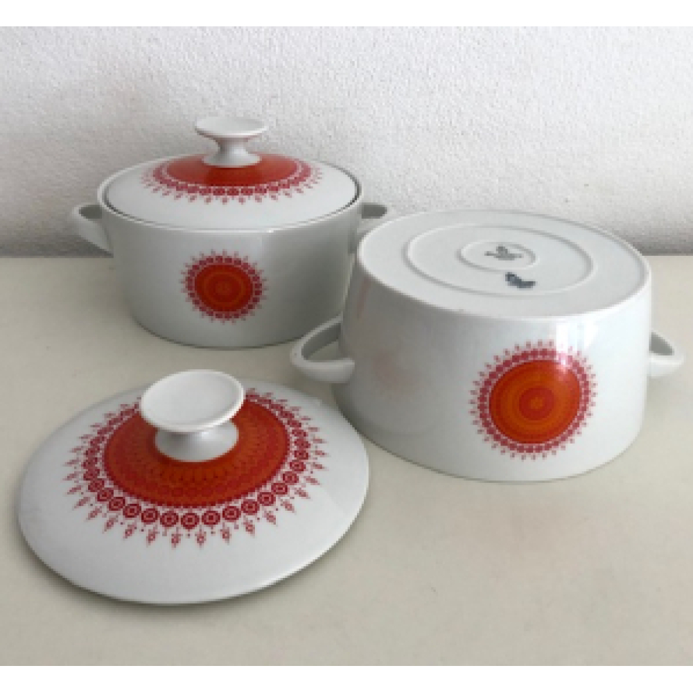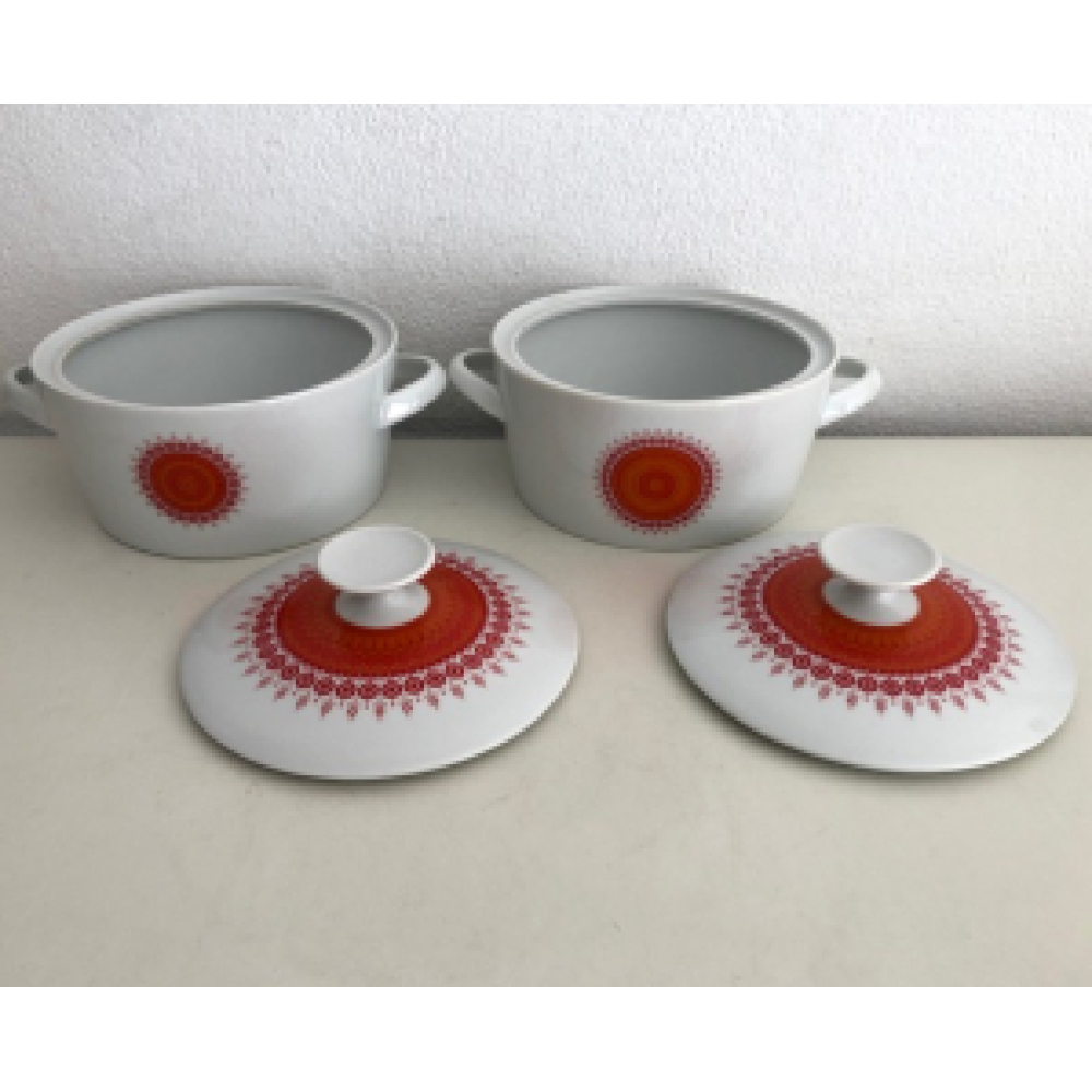 Mooie vintage dekschalen; 2 schalen met rood oranje mandala decor aan de zijkanten